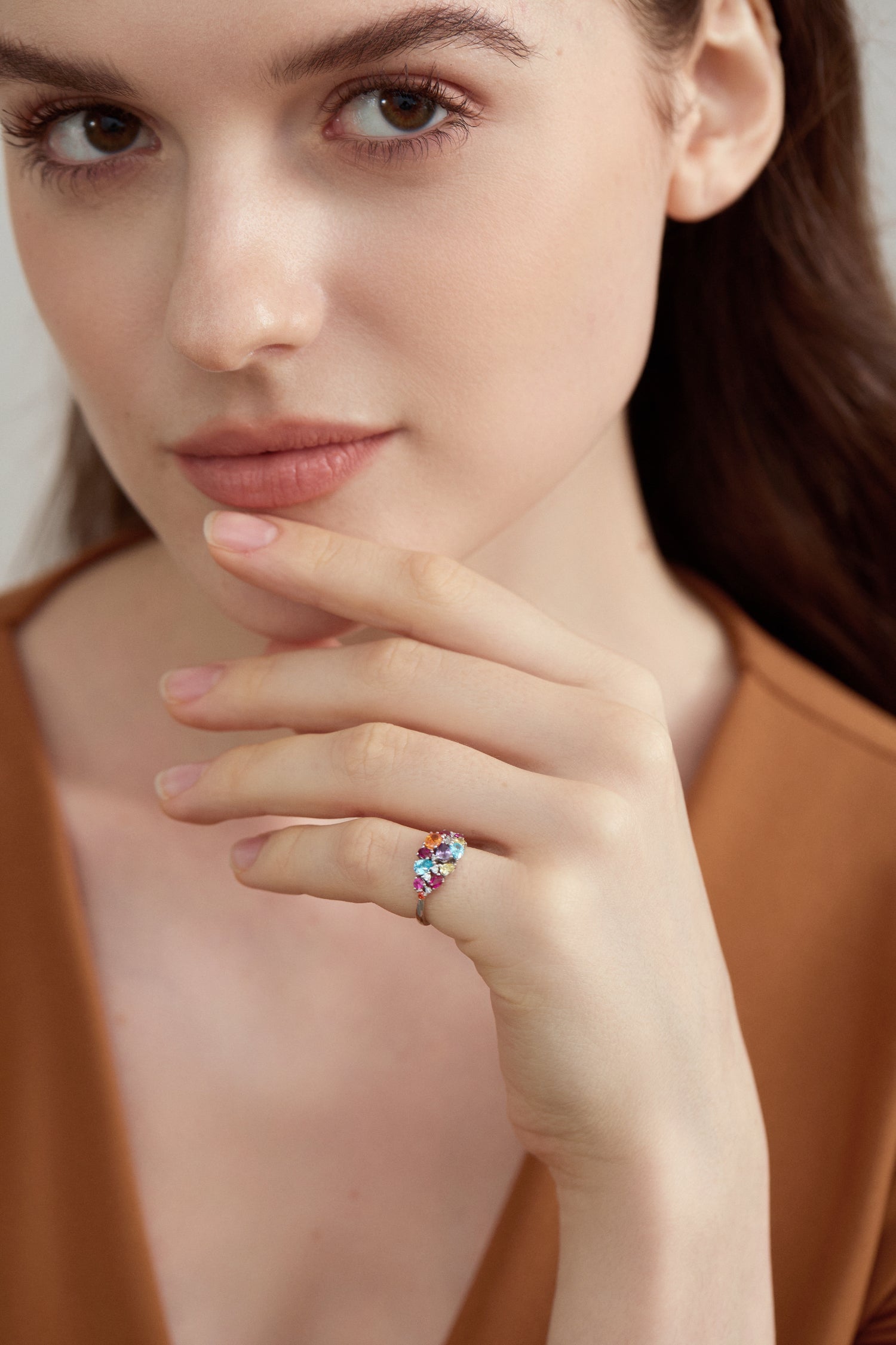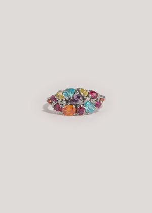 The Blooming Cluster Ring bursts with vibrant colors, capturing the lively essence of a blossoming garden. This intricate design showcases a stunning array of mixed gemstones, thoughtfully arranged to create a captivating and playful piece that celebrates individuality and joy.