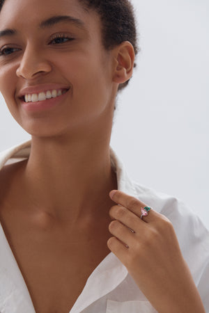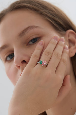 This elegant ring features a delicate pairing of a soft blue sapphire and a vibrant Padparadscha sapphire, arranged in a harmonious heart-to-heart design. The blend of hues represents unity and balance, making it a meaningful piece for celebrating everyday connections.