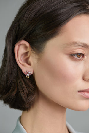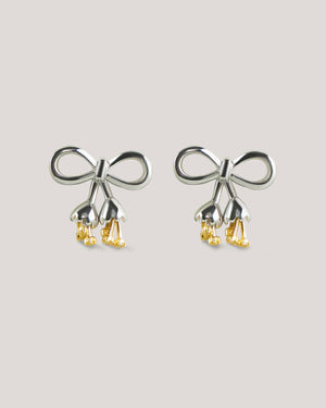 A delicate blend of floral elegance and playful charm, the Lily Bow Earrings take inspiration from the Lily of the Valley, symbolizing quiet grace. The refined bow silhouette adds a feminine touch, while the dainty yellow gemstone drops evoke the flower’s natural beauty.