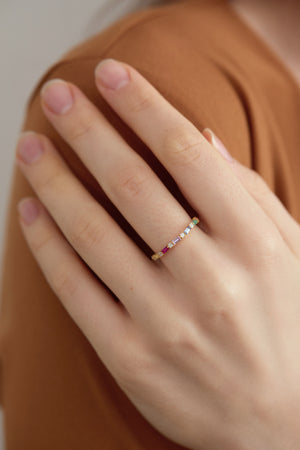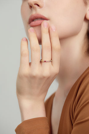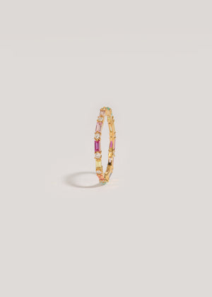 This delicate ring features a vibrant array of gemstones, including yellow sapphire, orange sapphire, pink sapphire, tsavorite, and ruby. The alternating baguette and round cuts create a unique, colorful band that adds a touch of playful elegance to any outfit.