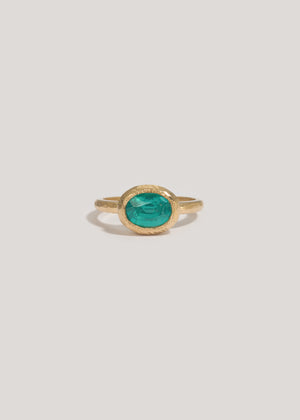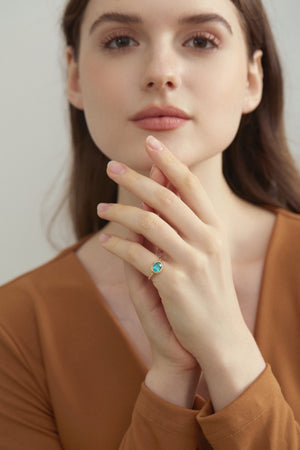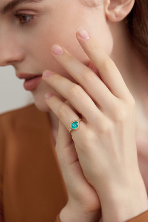 This elegant ring is designed to evoke a timeless, vintage allure, featuring a captivating Paraíba gemstone at its center with a radiant, vivid blue-green hue. The gold band has a subtly textured finish, adding to the piece's antique charm while maintaining a modern edge. Perfect for those who appreciate a blend of classic sophistication and contemporary style, this ring can also be worn as a pinky ring, adding a touch of playful mischief.